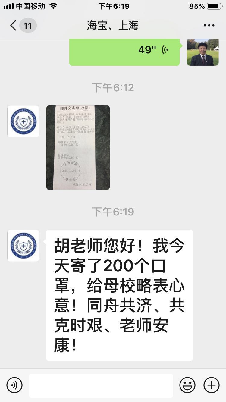 2020年3月9日,承载者betway西汉姆联官网1988届毕业校友海宝先生爱心的200个医用外科口罩的快递从上海来到了内蒙古师范大学。疫情发生后,海宝先生一直心系母校,四处奔走为母校采买防疫用品,在口罩极难买到的情况下,想方设法购买到200个医用外科口罩,2020年3月5日,海宝先生与学校校友会联系并寄出了自己的一片赤诚之心。在非常时期,海宝先生对学校的厚爱和深情,极大地激励了学校和学院的师生。学院为有海宝先生这样有担当的校友感到自豪。在此,对海宝先生表示衷心的感谢并致以崇高的敬意!