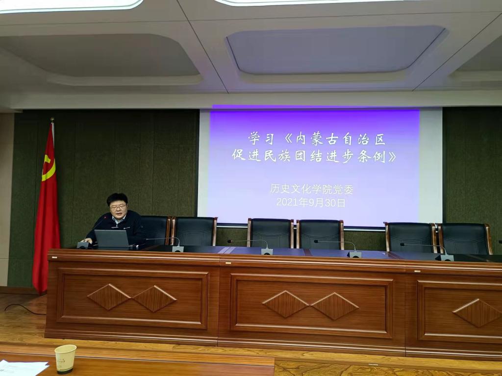 9月30日下午,在赛罕校区文史楼1号会议室,betway西汉姆联官网全体教师学习《内蒙古自治区促进民族团结进步条例》,本次学习由学院党委副书记宋磊主持。