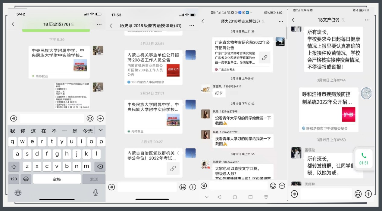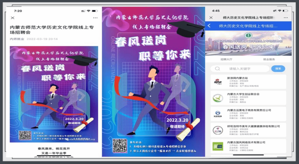 面对新冠肺炎疫情给就业工作带来的新挑战,学院主动出击,找单位、找岗位、找信息。加大需求信息的搜集和发布力度的同时,进一步挖掘校友、专业教师等资源。3月20日至25日举行内蒙古师范大学betway西汉姆联官网“春风送岗·职等你来”网络双选会,邀请62家企业为毕业生提供岗位需求206个。学院于3月18日面向重点群体举办“赋能你我·共创未来”大学生创新创业系列讲座,内容涵盖创新创业、赋能你我、创业政策、互联网+等,通过“线上知识讲授+一对一咨询答疑”的形式,助力重点群体学生顺利就业。学院开通就业先锋微信公众号,专题推送就业信息,开辟“师哥师姐说”栏目,邀请已就业毕业生现身说法,传授求职经验。