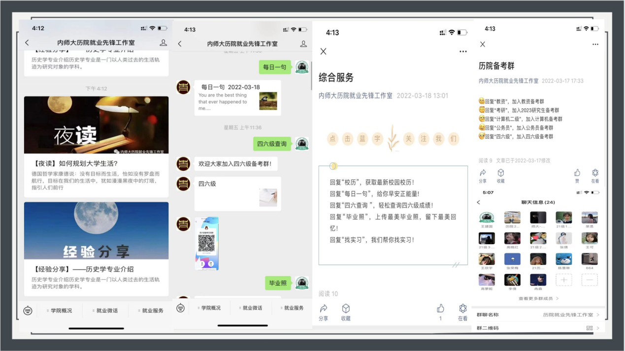学院根据疫情防控期间就业形势的变化和就业工作方式的调整,加强线上就业创业指导和服务工作,成立就业先锋工作室,打造就业创业专属服务阵地。利用学院就业先锋微信公众号,推出“就业微话”“经验分享”“求职技巧”“就业分享会”等全新微信专栏,为毕业生推送更有针对性的就业技巧、职业选择、择业心态等方面相关资讯。同时,职业生涯与就业指导咨询室由专职辅导员定期开展线下职业生涯规划咨询与就业指导工作以及提供线上知识讲授及在线答疑服务,面向计划参加第八届“互联网+”创新创业大赛的创业团队提供线上一对一咨询辅导服务。