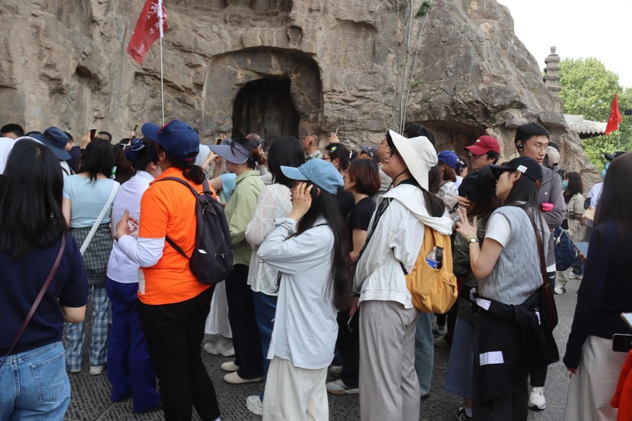 午后,继续驱车洛阳,于伊水河畔邂逅世界文化遗产—龙门石窟。在景区讲解员的带领下,同学们沿西山石窟群拾级而上,从宾阳三洞的北魏遗风到奉先寺卢舍那大佛的盛唐气象,在斑驳石刻间感受佛教艺术中国化的千年嬗变。