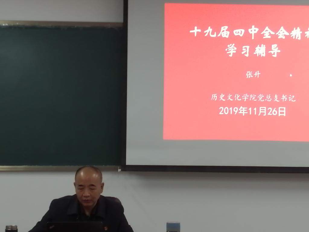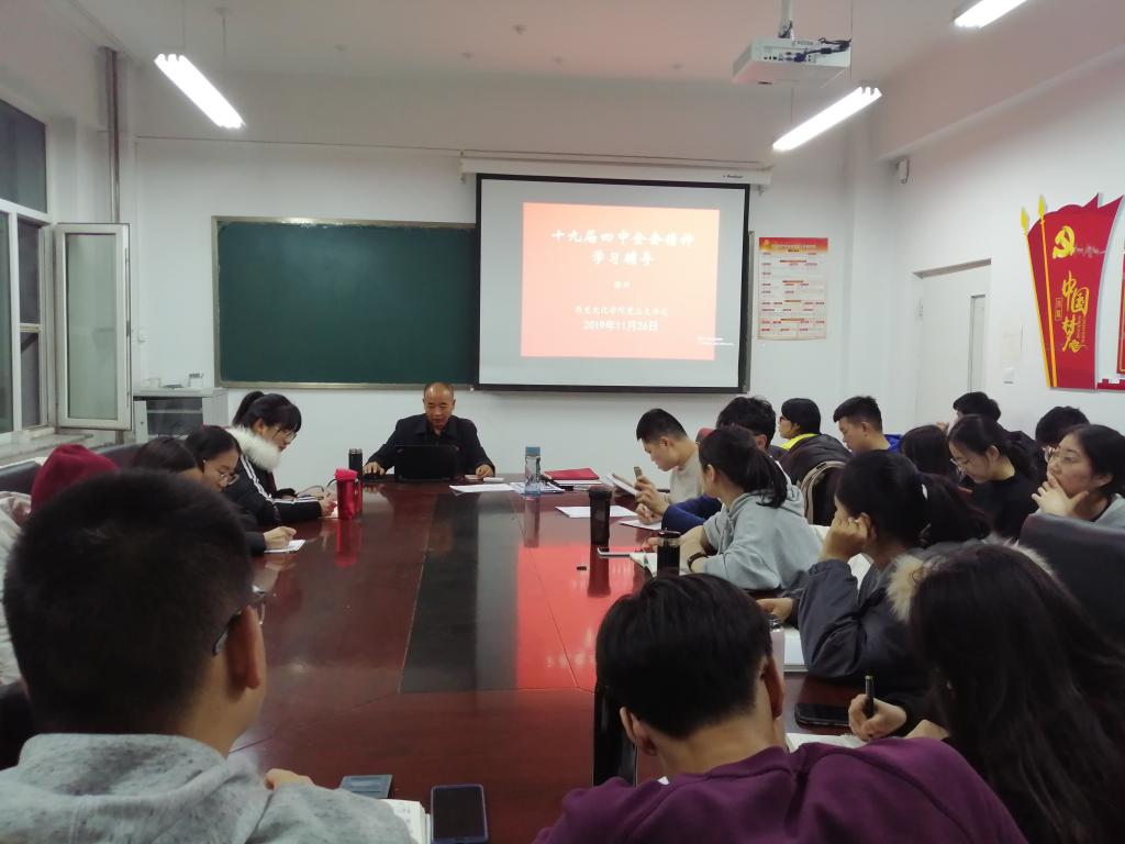 2019年11月26日晚7:30,betway西汉姆联官网学生党支部组织专题党课,邀请学院党总支书记张升老师为大家做“党的十九届四中全会精神学习辅导”,学院学生党支部全体党员参加学习辅导,辅导中,张升书记就《中国共产党第十九届中央委员会第四次全体会议公报》、《中共中央关于坚持和完善中国特色社会主义制度 推进国家治理体系和治理能力现代化若干重大问题的决定》和习近平总书记所做的《关于〈中共中央关于坚持和完善中国特色社会主义制度 推进国家治理体系和治理能力现代化若干重大问题的决定〉的说明》三份文件的重要意义、内容和学习要点进行了详细讲解。