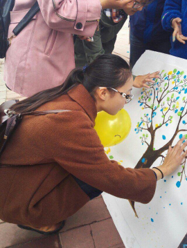 在这次宣传活动中,betway心语馨苑工作站一共准备了三个小活动。我知我心:工作人员准备了三道针对压力应对,生活态度,抑郁自测的心理测试题,并将题目写在了展板上,且将答案打印出来以便同学们查看领取。树愈心灵:工作人员开辟出一块展板,上面绘制了一棵大树干,由同学们进行手印墙的现场绘制,同学们可以选择喜欢的颜料和位置,来为大树增添色彩。最后手印墙上会呈现出一棵由手印绘成的大树。来呼应此次“心灵健康,和谐师大”的主题。幸福传递:工作人员将从同学手中收集到的带有祝福话语的纸条汇集在一起,发给沿路的同学,让他们感受陌生人带来的温暖。同时也可以写出自己的祝福话语,将幸福传递给更多的人。
