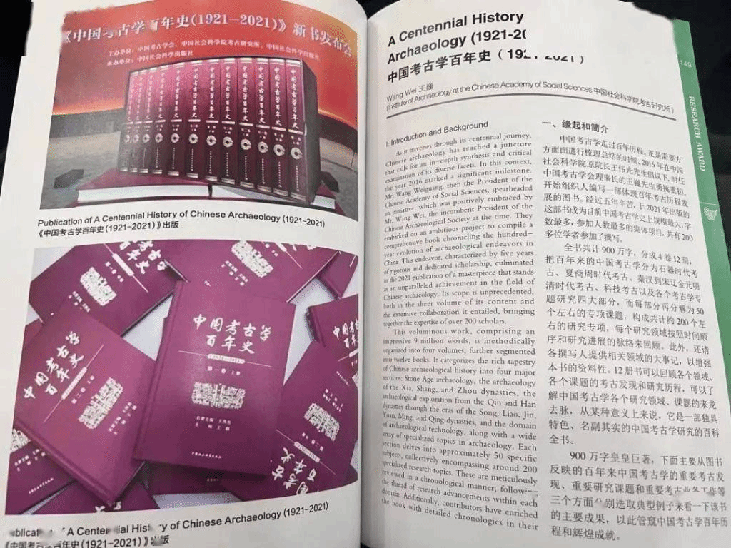 2023年12月15日由中国社会科学院、上海市人民政府共同主办,中国社会科学院考古研究所(中国历史研究院考古研究所)、上海市文物局、上海研究院和上海大学承办的第五届主题为“气候变化考古与社会可持续发展”的第五届“世界考古论坛·上海”在上海大学开幕,本届世界考古论坛评出十个项目获得世界重要考古研究成果奖。中国社会科学院学部委员王巍主编、中国社会科学出版社出版的《中国考古学百年史(1921-2021)》荣获第五届世界考古论坛重要考古研究成果奖,是唯一入选的中国考古研究成果。